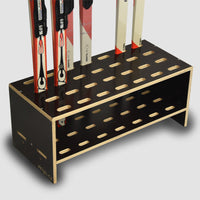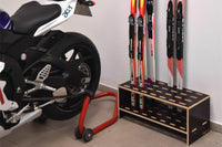 - Pratique : Le support de ski de fond est livré déjà monté. Il est fabriqué en contreplaqué laminé de 12 mm d’épaisseur. Les dimensions du support pour 14 paires sont de 61 x 27 cm.
